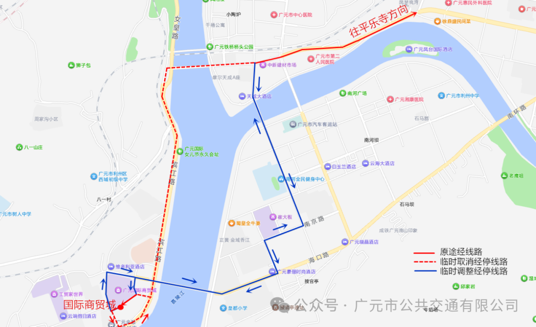 調(diào)整后經(jīng)停站點:途經(jīng)供排水公司、南河汽車站(西)、南河體育場、玉樹家園、皇都首座至國際商貿(mào)城: